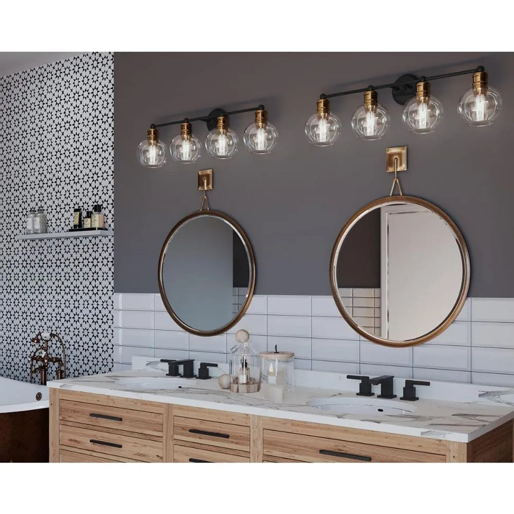Bring timeless elegance to your bathroom with the Hansford Collection 4-Light Bath Vanity Light. Featuring clear glass shades and an antique bronze finish, this fixture blends coastal charm with classic sophistication.